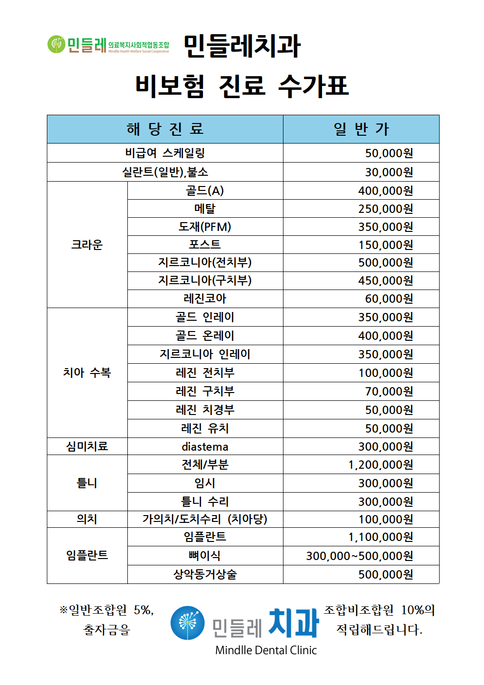 민들레 일차의료센터 비보험 진료 수가표