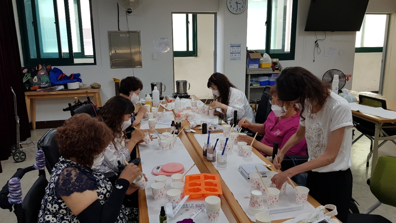 여성장애인들의 친정 같은 곳 대전 여성장애인연대 강의실에 모여 천연비누 만들기를 하였습니다.