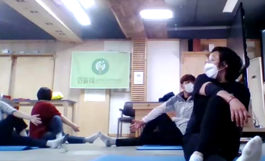 장애인체육회 선생님과 함께 운동을 함